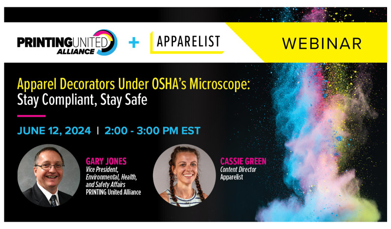 Gary Jones, vice president of environmental, health, and safety affairs at PRINTING United Alliance, will lead the discussion with support from Cassie Green, content director of Apparelist, the media brand under PRINTING United Alliance dedicated to supporting the apparel decorating community.