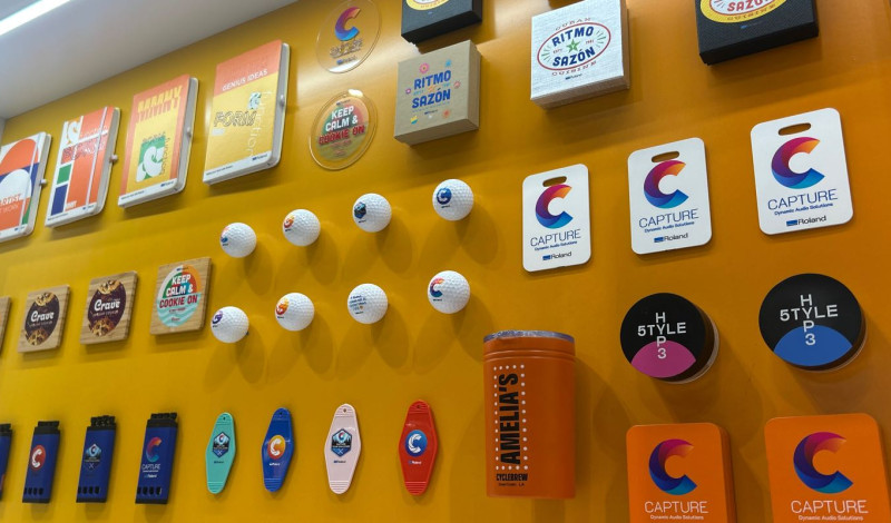 On the UV-LED side of things, LogoJET showcased its flexible inks, which allow for textured UV printing on various substrates, creating effects like soft-touch finishes for journals and 3D texture for items like promotional tokens, packaging, leatherette patches, and more.